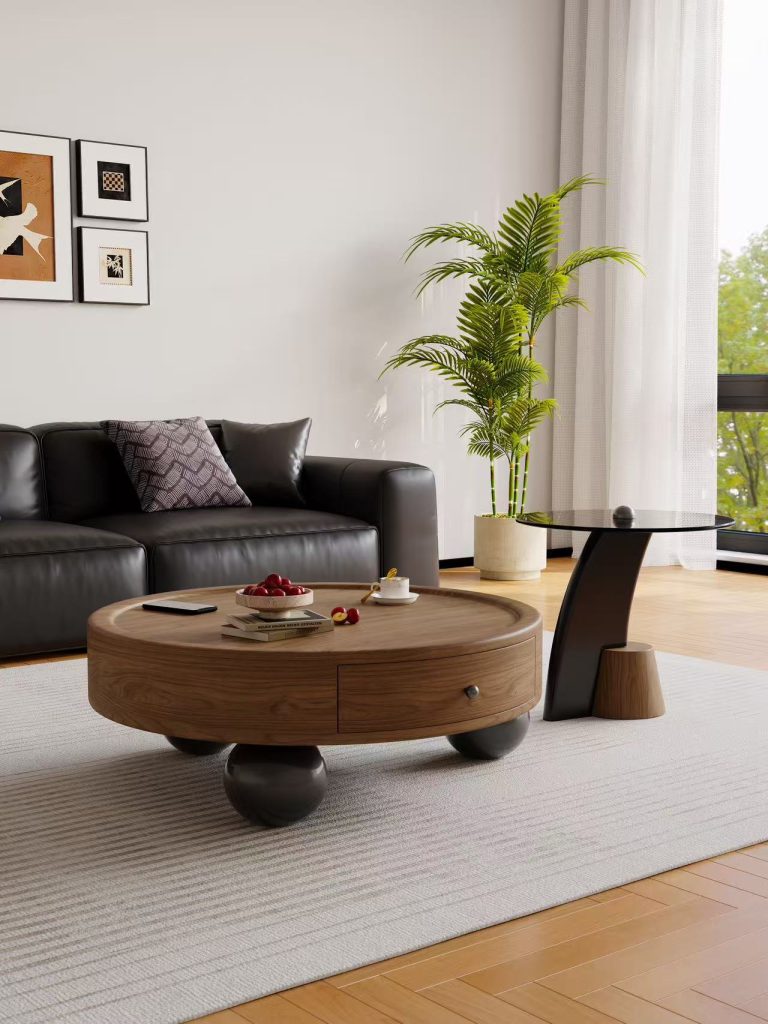Coffee Table/Small Side Table – Wooden Top Round Coffee Table with Drawer & Spherical Base (φ80/90cm, H45cm)