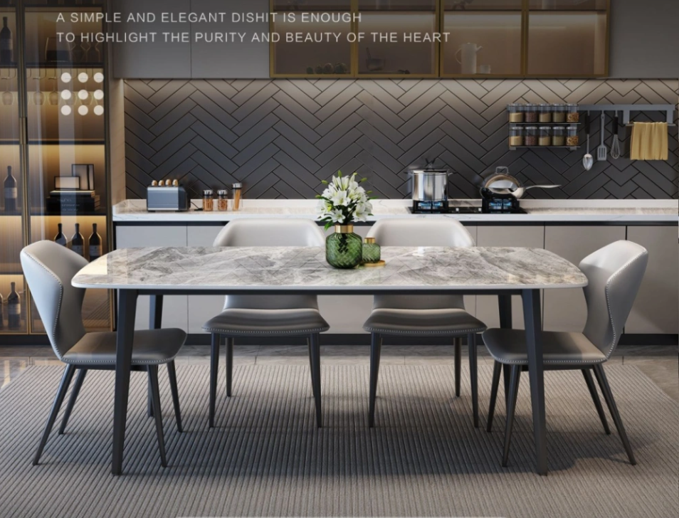 This dining Table is a functional set for B2B buyers (office canteens, boutique restaurants). Details: – Tabletop: Sintered stone—waterproof, chemical-resistant, suitable for frequent use. – Dimensions: 1.4m/1.6m/1.8m (size adjustments for large orders). – Table Legs: Slim heavy-duty metal legs (space-saving); custom solid wood legs available. – Chairs: Compact chairs with metal legs & padded seating (custom color/fabric for bulk orders). – B2B Advantages: Bulk discounts, fast production lead time, batch quality inspection, OEM/ODM capabilities.
