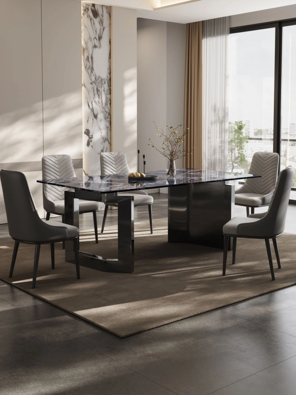 This Dining Table is a commercial-grade dining set tailored for B2B buyers (hotels, restaurants, furniture distributors). Key features: – Tabletop: High-quality sintered stone/rock slab—scratch-resistant, heat-resistant, and easy to clean (ideal for high-traffic spaces). – Dimensions: 1.4m/1.6m/1.8m (custom sizes negotiable for bulk orders). – Table Legs: Sturdy metal legs (150kg load capacity); custom solid wood legs available for personalized styling. – Chairs: Included with metal legs + padded seat/backrest (fabric/color customization supported). – B2B Advantages: Flexible MOQ, bulk pricing discounts, OEM/ODM services, and timely delivery for large projects.